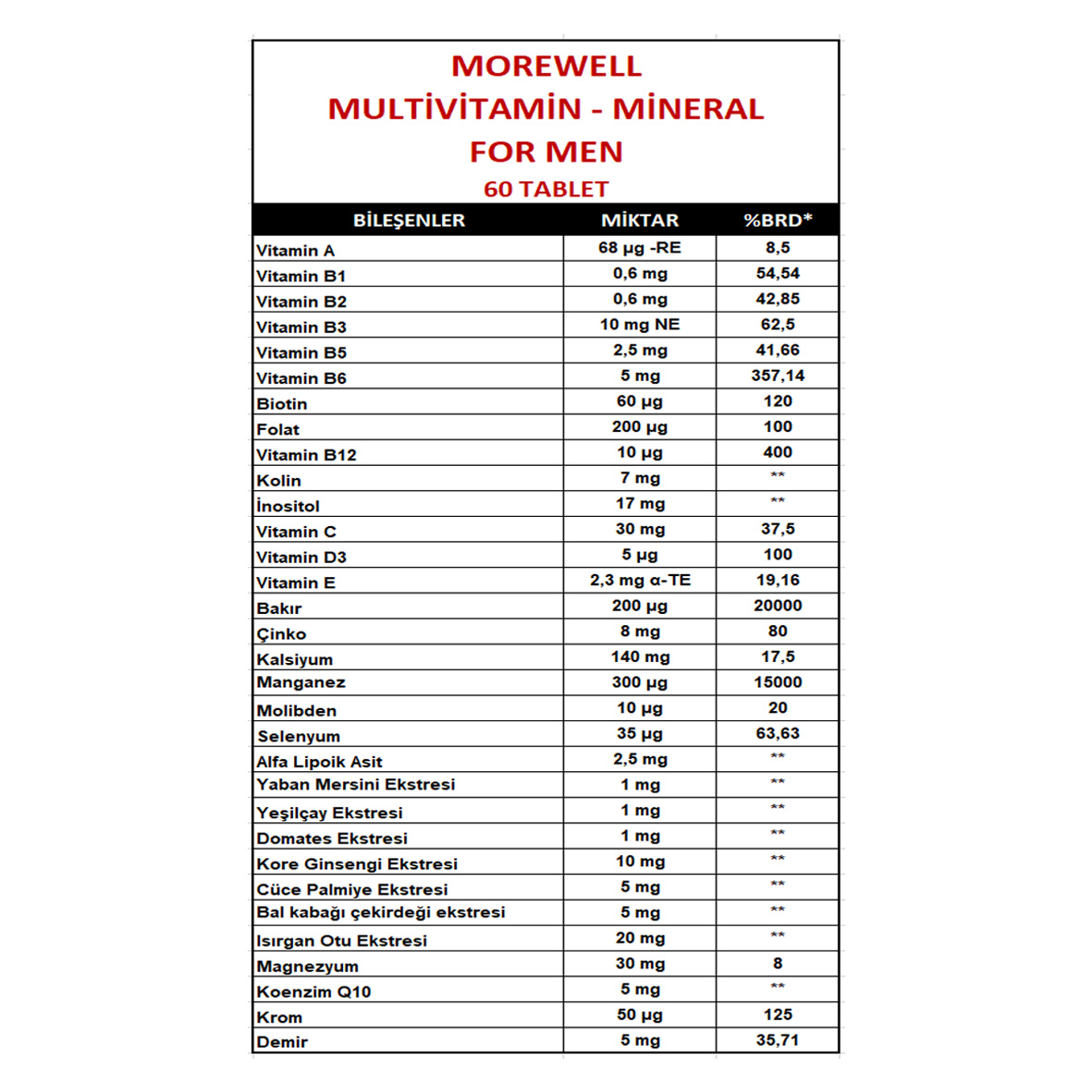 * Tavsiye Edilen Günlük Alım Dozu: 11 yaş ve üzeri yetişkinler için günde 1 veya 2 tablet tüketilmesi uygundur.