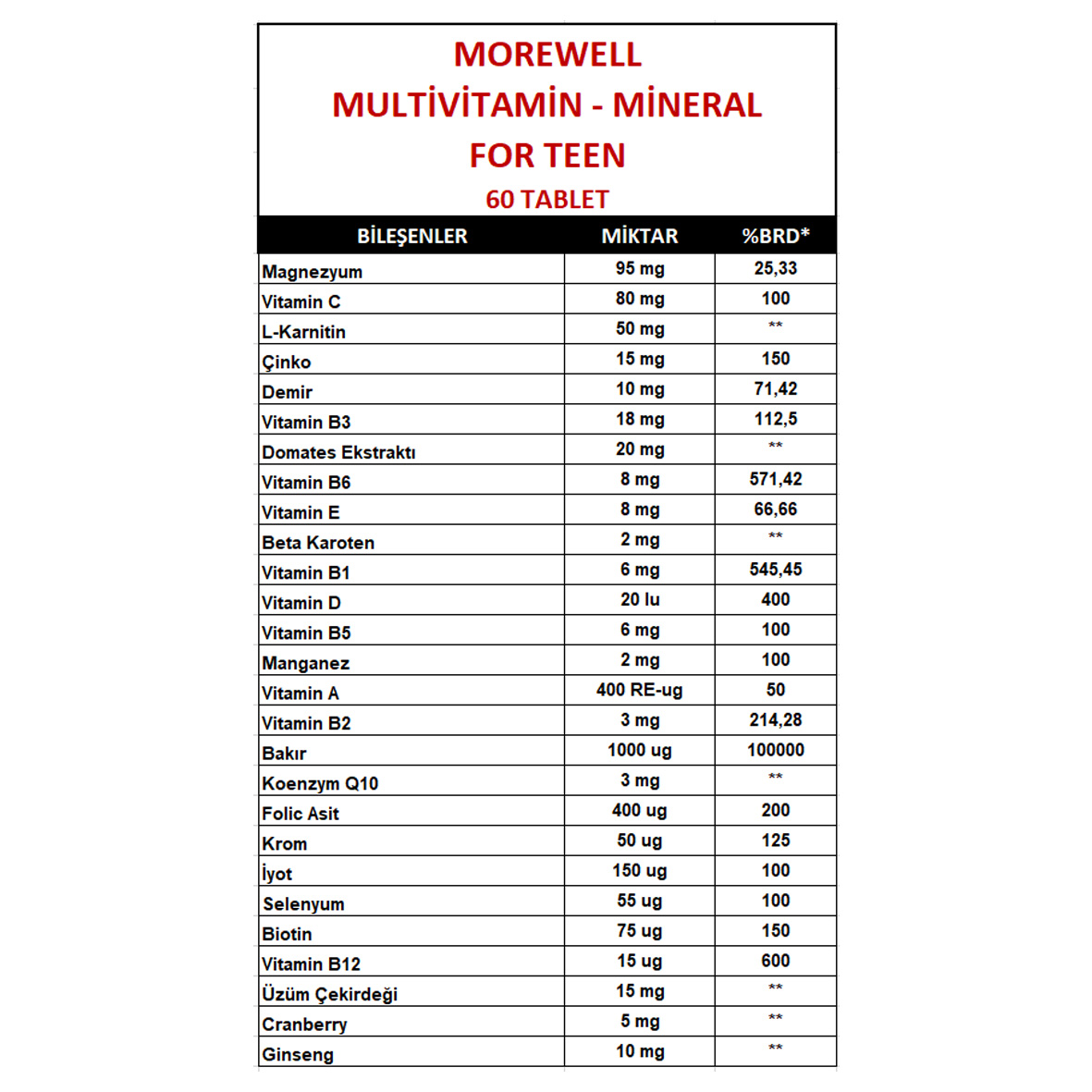 * Tavsiye Edilen Günlük Alım Dozu: 11 yaş ve üzeri yetişkinler için günde 1 veya 2 tablet tüketilmesi uygundur.